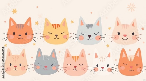 Colorful Cartoon Cat Faces With Whimsical Expressions and Decorative Stars