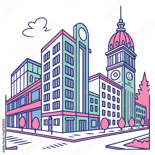 Colorful cartoon city streetscape shows modern buildings and a classic clock tower structure