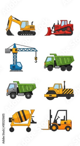 Colorful cartoon construction vehicle illustration against a white background showcasing various