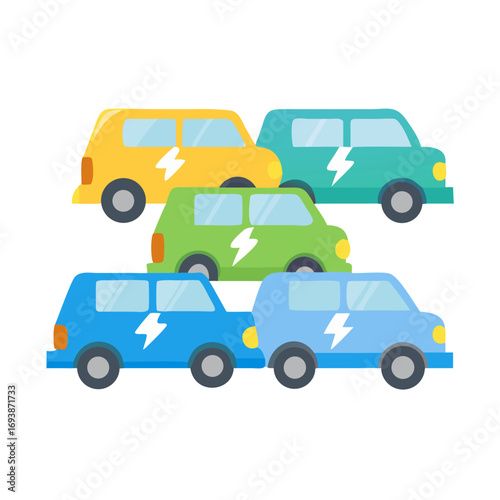 Colorful cartoon electric cars arranged in a stack formation on a black background
