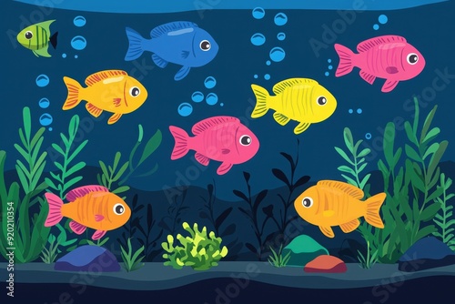 Colorful cartoon fish swim in a vibrant underwater scene, surrounded by aquatic plants and bubbles, perfect for children's decor.