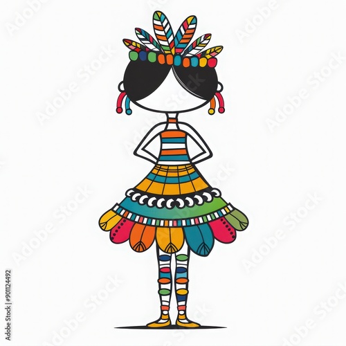 Colorful cartoon girl in a feathered headdress wearing a vibrant dress, perfect for children's themes and playful designs.