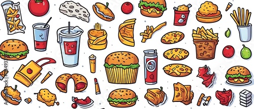 Colorful cartoon illustration of various fast food items, including burgers, fries, and drinks, scattered across a white background.
