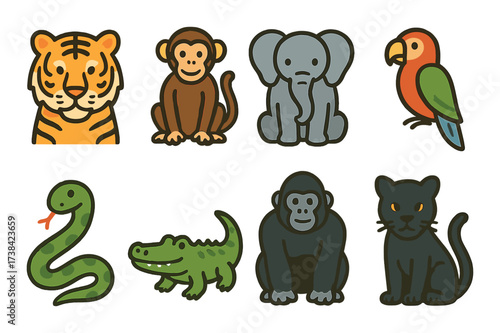 Colorful cartoon jungle animals collection with tiger, monkey, elephant, and more