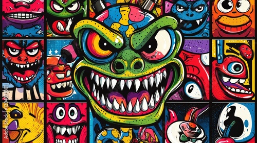 Colorful Cartoon Monsters with Unique Expressions in a Fun and Vibrant Collage