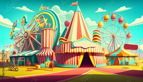 Colorful cartoon style carnival amusement park and funfair background, Generative AI