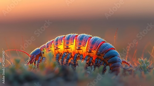 Colorful caterpillar resting on grass at sunset, showcasing vibrant hues and nature's beauty