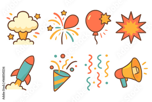 Colorful Celebration Icons. Flat vector mini-illustrations boom in colors children's illustrations: explosion cloud, fireworks,