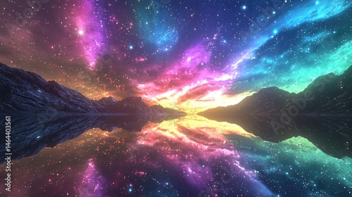 Colorful celestial reflection over a mirrored landscape.