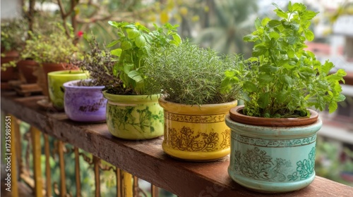 Colorful ceramic pots filled with fresh herbs arranged on a wooden railing in a vibrant garden setting showcasing greenery and natural beauty