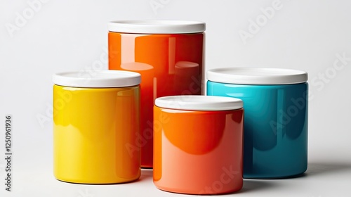 Colorful ceramic storage containers, vibrant kitchen organization on a white backdrop