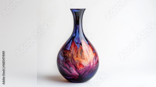 Colorful ceramic vase displaying intricate patterns and hues situated on a neutral background in a well-lit environment
