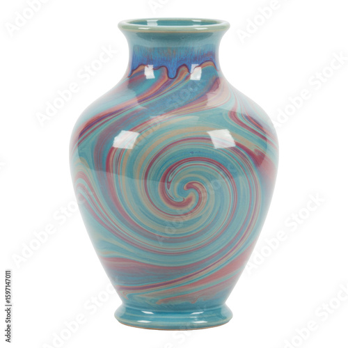 Colorful ceramic vase with swirling patterns, displayed on a minimalist shelf