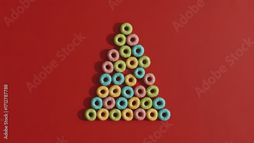Colorful cereal rings arranged in a triangle shape on a red background