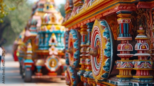 Colorful ceremonial chariots are beautifully decorated and lined up ready for the Ratha Yatra festival