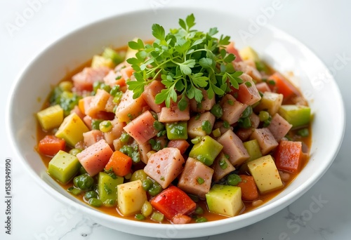 Colorful ceviche with tuna and avocado, topped with microgreens, minimal background, vibrant and sharp studio image.
