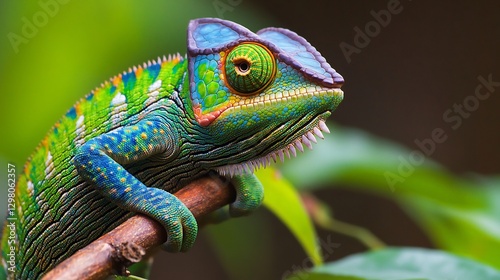 Colorful Chameleon gripping a branch its vibrant skin shifting through brilliant shades of green blue and yellow bulging eyes scanning its surroundings