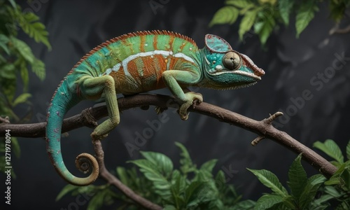 Colorful chameleon on a branch isolated against a dark background with vibrant green foliage, nature isolated, colorful lizard