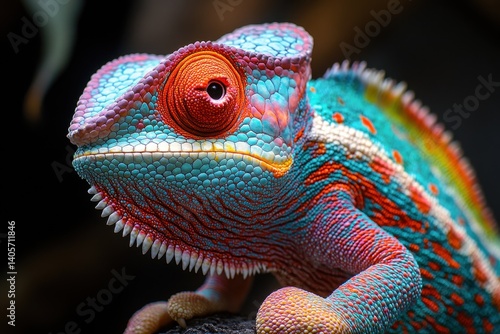 Colorful chameleon perched on a branch in a lush tropical setting during daylight hours