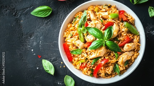 Colorful Chicken Fried Rice with Fresh Basil on Dark Background