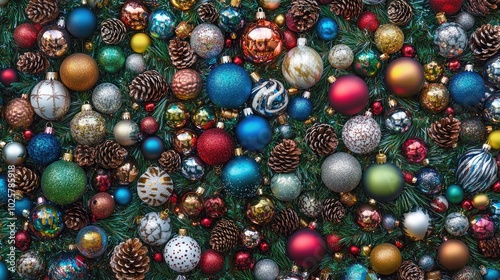 Colorful Christmas Ornaments and Pine Cones Arrangement