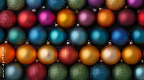 Colorful Christmas ornaments arranged in a festive pattern.