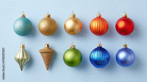 Colorful Christmas Ornaments on Light Blue Background for Holiday Decoration and Celebration, Featuring Various Shapes and Textures
