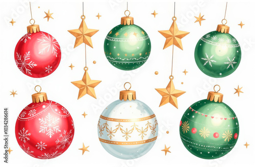 Colorful Christmas tree balls and stars on a white background. Illustration