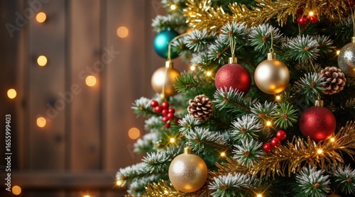 Colorful Christmas tree decorated with ornaments and lights creating a festive atmosphere in a cozy indoor setting