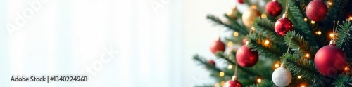 Colorful Christmas tree with lights and ornaments against a white background, holiday, Christmas tree, lights