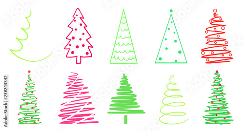 Colorful christmas trees on white. Set for design on isolated background. Geometric art. Objects for polygraphy, posters, t-shirts and textiles. Colored illustration