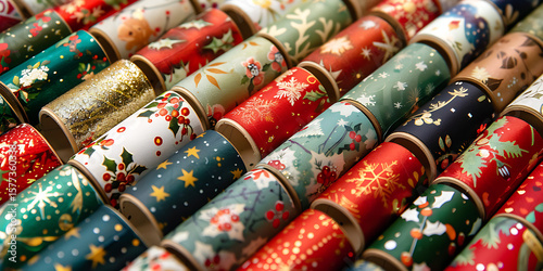 Colorful Christmas Wrapping Paper Rolls in Festive Red, Green, and Gold Designs