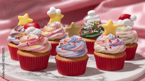 Colorful Christmas-themed cupcakes are beautifully arranged on a marble platter. Each cupcake features swirls of vibrant frosting and charming festive decorations like stars and Santa hats