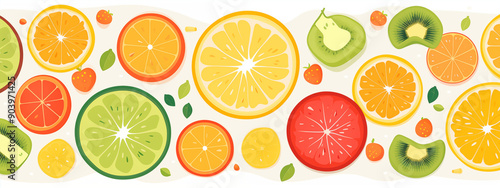 Colorful Citrus Fruit Pattern Featuring Orange Lemon Lime Kiwi And Strawberry Slices With Leaf Accents