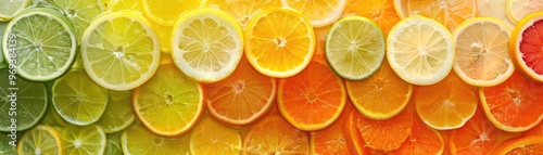 Colorful citrus fruit slices arranged in rainbow spectrum for fresh and vibrant background. AI
