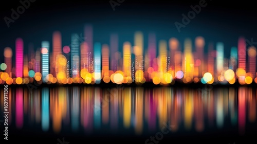 Colorful city skyline reflected on dark water at night.