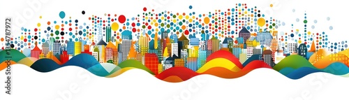 Colorful Cityscape Illustration with Abstract Dots and Wavy Lines for Design