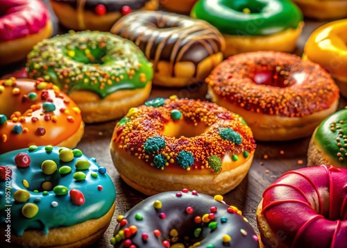 Colorful Close-Up of Glazed Donuts with Sprinkles in Low Light Photography for a Sweet Treat Display