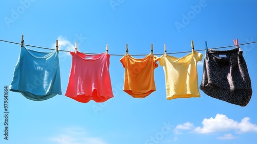 Colorful Clothes Drying on a Clothesline Against a Bright Blue Sky