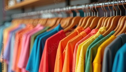 Colorful clothes on hangers in shop. Variety of colors red orange yellow green blue. Wooden hangers. Clothing sale, fashion store, retail business, trendy clothes.
