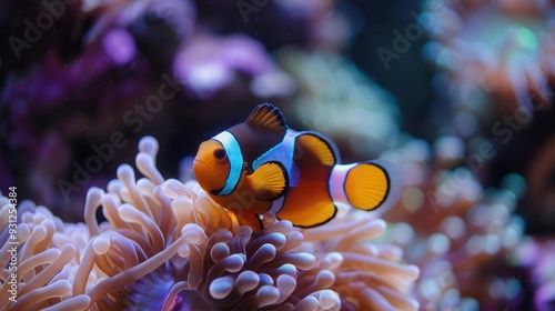 Colorful clownfish hiding in sea anemone, coral reef,