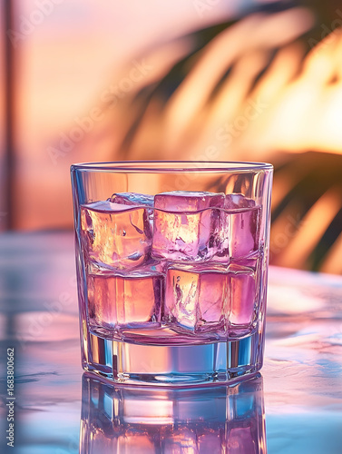 Colorful cocktail with ice in a glass against a vibrant sunset backdrop during evening relaxation
