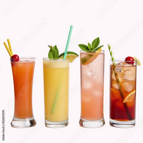 Colorful cocktails displayed in unique glassware with garnishes and set against a vibrant yet simple backdrop