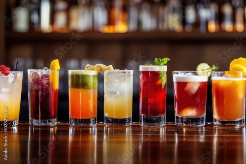 Colorful cocktails in glasses lined up on bar, showcasing variety of vibrant drinks. Each glass features unique garnishes, creating inviting and festive atmosphere