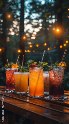 Colorful cocktails on a wooden table during a summer evening garden gathering