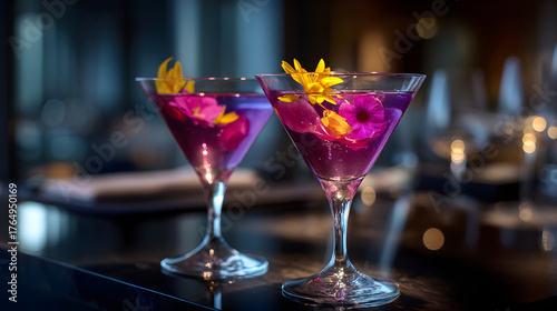 Colorful cocktails with vibrant flowers served in elegant glasses on a stylish bar counter