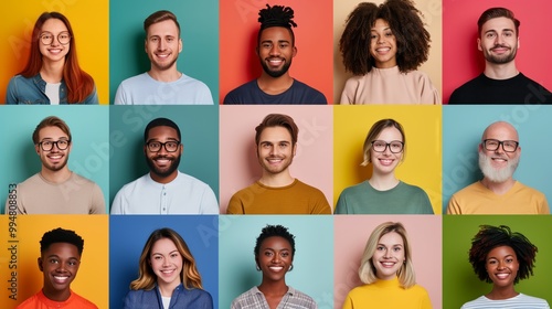 Colorful Collage of Smiling People on Multicolored Backgrounds for Diversity and Community Themes