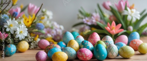 Colorful collection of decorated eggs and flowers arranged on wooden table for spring celebration.