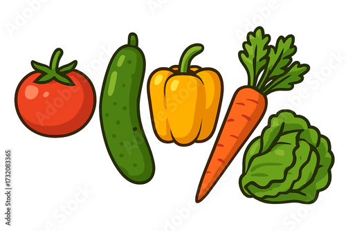 Colorful collection of fresh garden vegetables featuring a ripe tomato, crisp cucumber, vibrant yellow bell pepper, long orange carrot, and leafy green lettuce