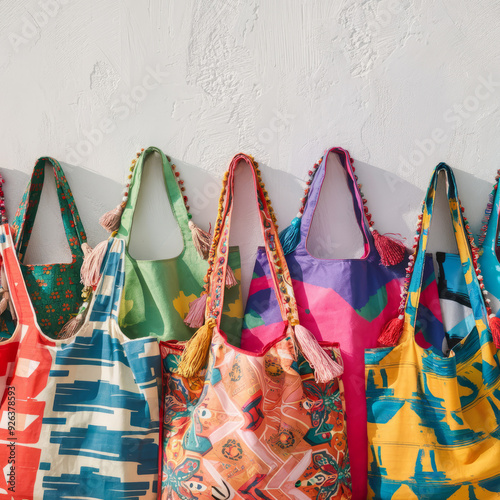 Colorful Collection of Patterned Tote Bags Hanging on Wall, Eco-Friendly Fashion, Sustainable Accessories
